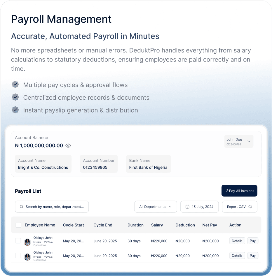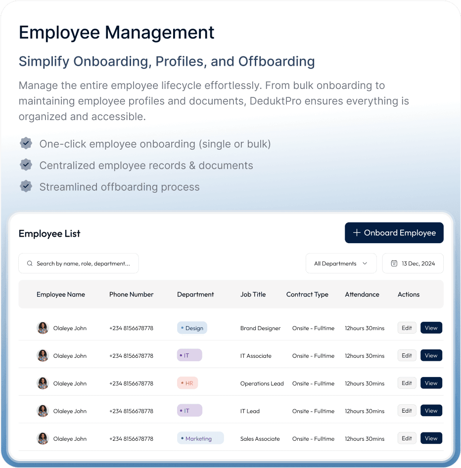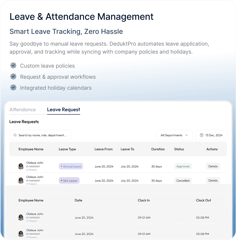 DeduktPro is an all-in-one HR and payroll solution designed for African businesses. It simplifies HR operations, automates payroll, ensures compliance, and provides employees with access to financial services like loans and savings.