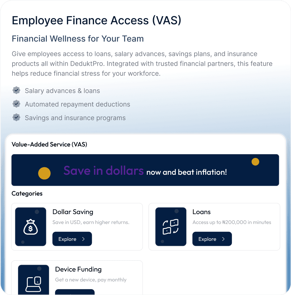 DeduktPro streamlines workforce management by uniting HR, payroll, compliance, and financial wellness in one platform. From onboarding to benefits like loans and savings, it ensures smooth operations while prioritizing employees. Secure, Scalable, and Compliant, DeduktPro saves time, reduces errors, and supports growing African businesses.